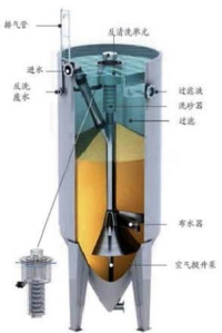 工作原理:活性砂過(guò)濾器基于逆流原理,待處理的原水通過(guò)進(jìn)水管進(jìn)入過(guò)濾器內(nèi)部,經(jīng)底部布水器均勻分配后向上逆流通過(guò)濾床,過(guò)濾后的濾液在過(guò)濾器頂部匯集后溢流排出過(guò)濾器系統(tǒng)。在空壓機(jī)的作用下,空氣提升泵將過(guò)濾器底層被污染的臟砂提升至過(guò)濾器頂部的洗砂器中,通過(guò)水流的紊流作用將砂表面的污染物分離出。清洗后的凈砂利用自重返回到砂床中,而清洗砂所產(chǎn)生的污水從過(guò)濾器的排污口排出。