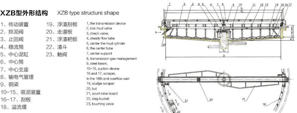 XZB型吸泥機一般用于大型(一般指流量大于500m3/h) 污水處理工程的幅流式沉淀池,特別適用于二沉池池底污 泥的刮集及外排。池形一般采用中心進水、周邊出水、中 心排泥,池底可不設坡度(平底結構),二沉池使用尤為廣 泛。水面浮渣、浮沫等雜物可由浮渣刮集裝置刮排至池外 渣坑或渣斗。靜壓排泥依靠各個管口閥門,調節流量流至 中心泥缸直接外排。虹吸排泥主要是利用真空泵抽真空進 行二次虹吸提升排泥力矩變化范圍較大的場合,可采用帶力矩保護裝置的軸裝 式減速機。